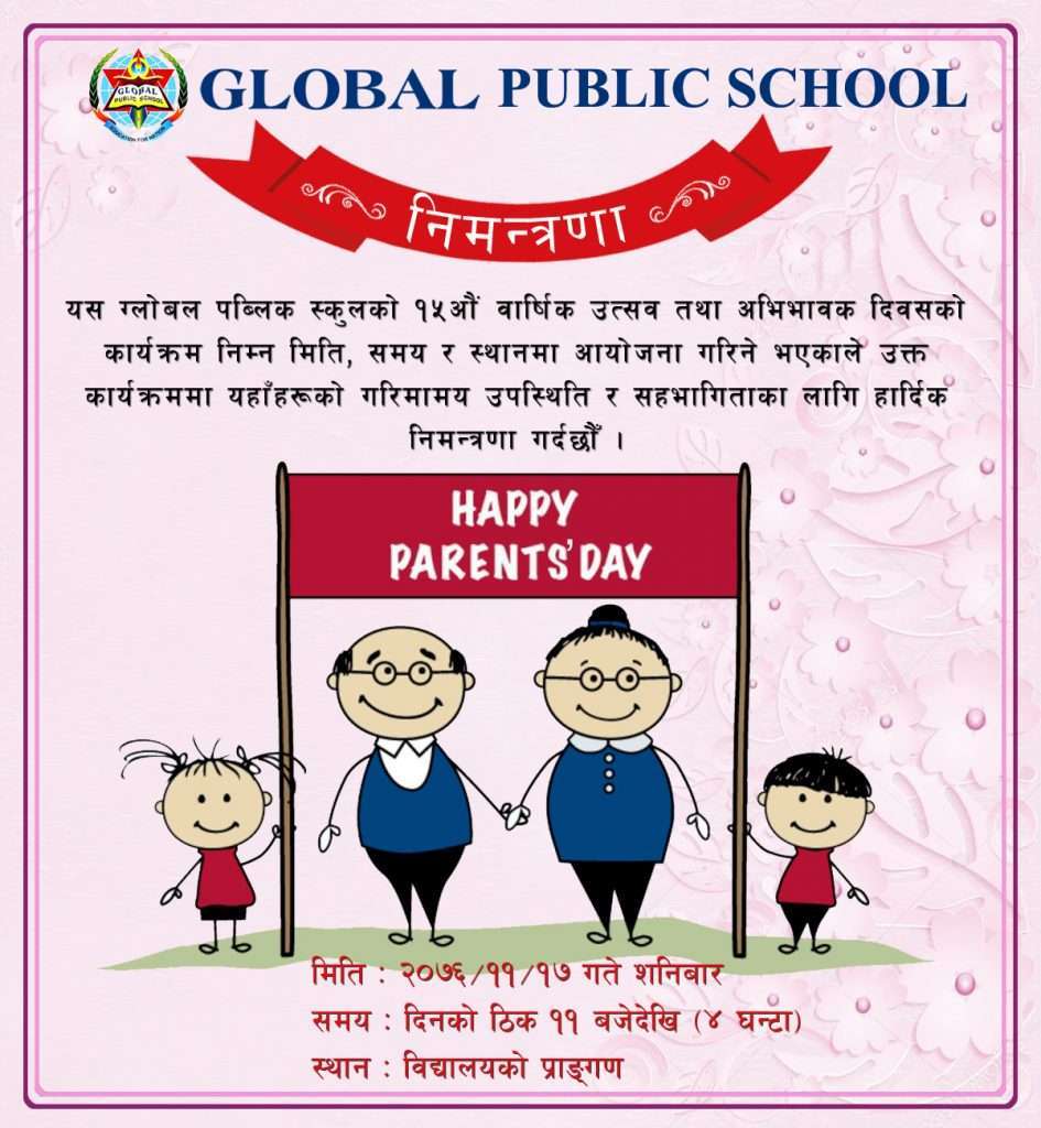 यस ग्लोबल पब्लिक स्कुलको १५औं वार्षिक उत्सव तथा अभिभावक दिवसको कार्यक्रम निम्न मिति, समय र स्थानमा आयोजना गरिने भएकाले उक्त कार्यक्रममा यहाँहरूको गरिमामय उपस्थिति र सहभागिताका लागि हार्दिक निमन्त्रणा गर्दछौँ ।